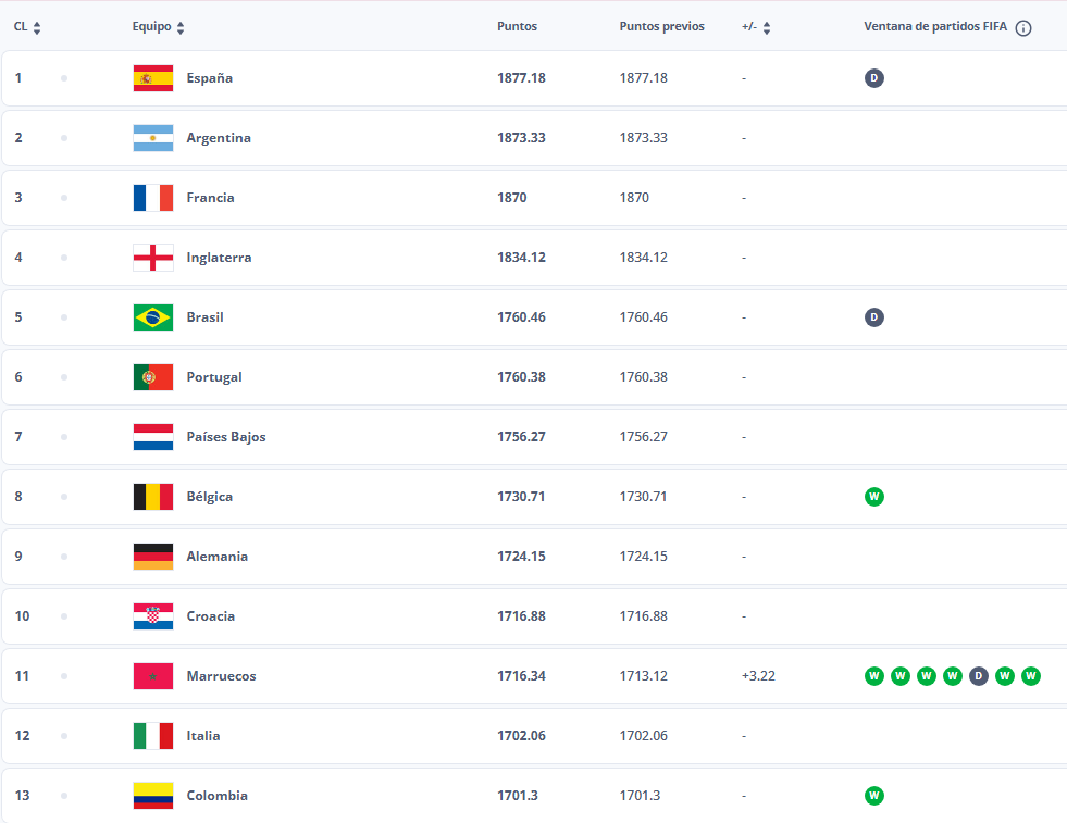 Esa Copa Árabe sí marca una diferencia en posiciones inferiores del ranking, donde las diferencias de puntaje entre las selecciones son más estrechas. Ahí ganar un partido marca una mayor diferencia en el escalafón.